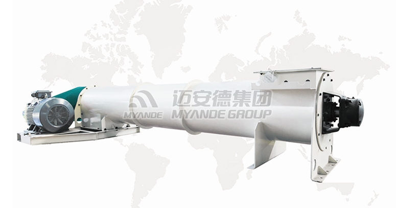 菌液或者水由泵通過霧化噴嘴噴吹進混合機內,其轉子上的槳葉沿軸向和周向按一定的規律交錯排列,且葉面與轉子軸線呈一定的角度,從而使葉面之間形成一個螺旋面。動力通過鏈輪由電機傳給轉子,轉子工作時一邊帶動物料不停地翻轉,物料與液體混合,一邊將物料向出料口推進,最終達到接種均勻的目的。