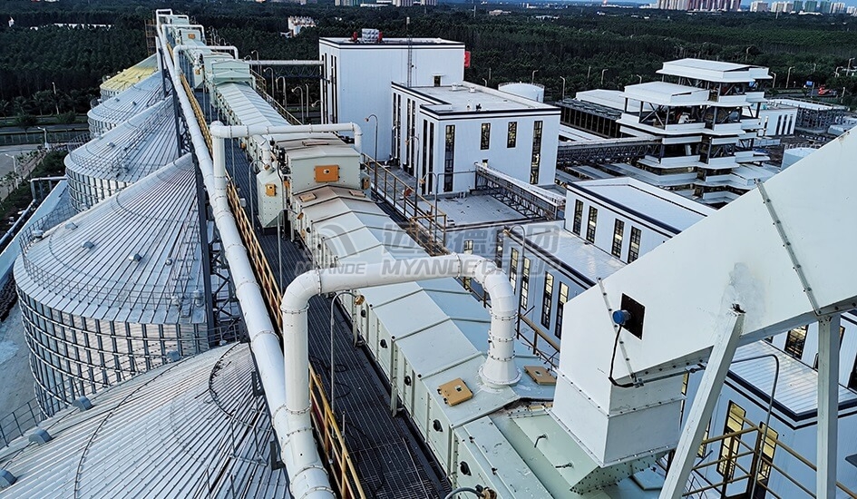 邁安德原糧筒倉捷運系統由投糧系統、清理系統、進倉系統、出倉系統、通風、鼓冷、熏蒸系統、糧情檢測系統、除塵系統等系統組成。卡車將原糧轉運至廠區并傾倒于投料坑中,原糧通過變頻刮板、提升機均勻地輸送至倉頂,再通過倉頂的輸送設備(刮板輸送機、皮帶輸送機)分配進倉。